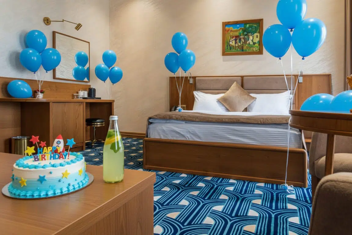 Тематическое украшение номера шарами (розовыми или голубыми).